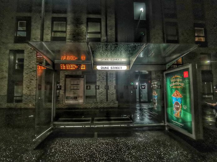Die Heimfahrt mit dem Bus indes gerät zum Abenteuer. Da uns der Bus Nummer Vier vor der Nase wegfährt, wollen wir die Nummer 90 in der Hoffnung, Richtung East End zu kommen nehmen. Es regnet – und es dauert eine ganze Weile im ungemütlichen und nachtdunklen Draußen, bis der Bus kommt. Wasser läuft die Scheiben herunter, wir setzen uns und sind gespannt, was passiert. Das Internet ist mangels zeitweiligen Empfangsaussetzern auch keine große Hilfe und eine Anzeige im Bus ist nicht vorhanden. Wir fahren und halten, fahren und halten – Menschen kommen und gehen, wir sitzen immer noch brav auf unseren Plätzen und harren der Dinge. Irgendwann hat Pia wieder Empfang, wir sind im richtigen Bus – umrunden allerdings die halbe Stadt – bis wir nach einer Stunde ein paar Meter von unserer Wohnung entfernt durchgefroren aussteigen. Tee und Gebäck. Abends nehmen wir einen flotteren Bus in Richtung George Square und besuchen noch einmal die Pizzeria. Nach einem Rundgang, der uns noch ein letztes Mal an den Clyde führt (der Feyenoord Tag ist nur ein bisschen übermalt) fahren wir mit dem Bus zurück und laufen an den Mauern der Brauerei vorbei heimwärts, die wir doch eben erstmals gesehen hatten.