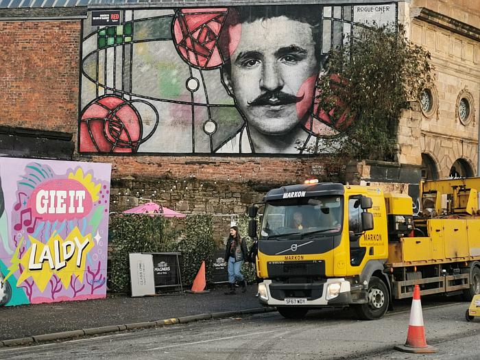 Ein neuer Tag. Wir frühstücken in einem kleinen Café auf der Duke Street, um anschließend den Bus Richtung Bahnhof zu nehmen. Von dort spazieren wir über die Sauchiehall Street Richtung West End und passieren das Teehouse Mackintosh at the Willow. Charles Rennie Mackintosh war ein zu Lebzeitenein bekannter Architekt und Designer, der verarmt in London starb und vergessen wurde. Es sollte Jahrzehnte dauern, bis sich Glasgow wieder an seinen bemerkenswerten Sohn erinnerte. Doch davon wird er auch nicht mehr gesund. Immerhin hat er nun sein eigenes Mural.