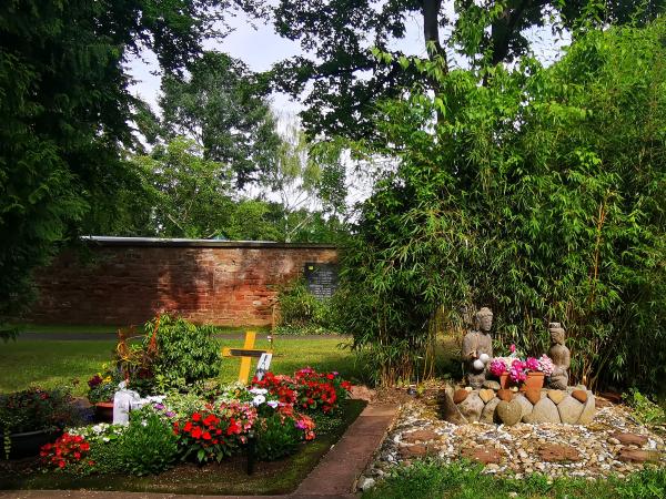 Danke, eine ortskundige Besucherin hat mir geholfen. Vom Eingang direkt an der Bushaltestelle Südfriedhof Ost muss man aber auch nur halbrechts Ausschau halten nach dem Bambus am Grab von Gert Trinklein.