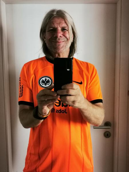 Mein Ziel ist der Riederwald, dort wo Holz und Trinklein früher trainierten, wo Bernd Nickel einst wohnte. Das Gelände hat sich verändert – wie so vieles, andere Menschen treiben Sport, verwalten oder verkaufen Merchandise im Fanshop. Heute hat die Eintracht ein ein neues Trikot vorgestellt, in Anlehnung an das nur einmal getragene orangene Infotec-Jersey aus der Saison 81/82. Ich besitze nicht viele Trikots der Eintracht. Aber das gefällt mir außerordentlich gut. L ist zu knapp aber XL passt. Wenig später verlasse ich nach einem Schwätzchen den Fanshop. In der Hand mein neues Trikot in orange. Was habe ich geschimpft als die Eintracht einen rosa Schal im Angebot hatte, auch als die UF aufgerufen hatten, in orange nach Karlsruhe oder Bordeaux zu fahren verweigerte ich mich als Traditionalist. Aber an einem Tag wie heute, an dem die Vergangenheit so eigenartig bunt leuchtet, darf ich das. Und es sieht ja auch schick aus, oder?