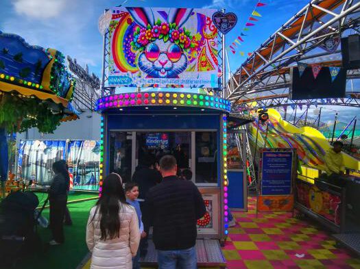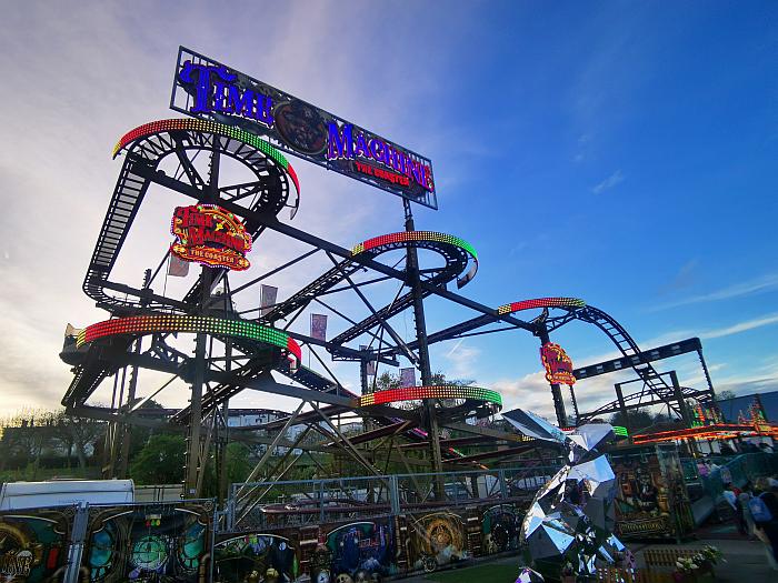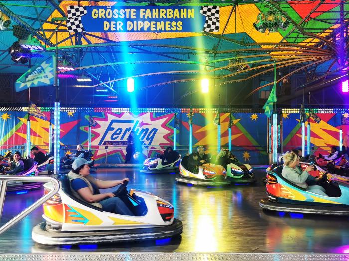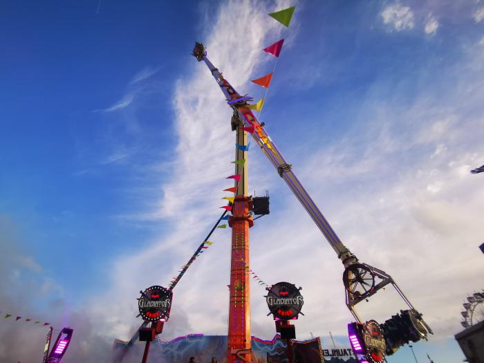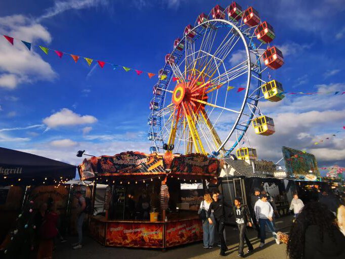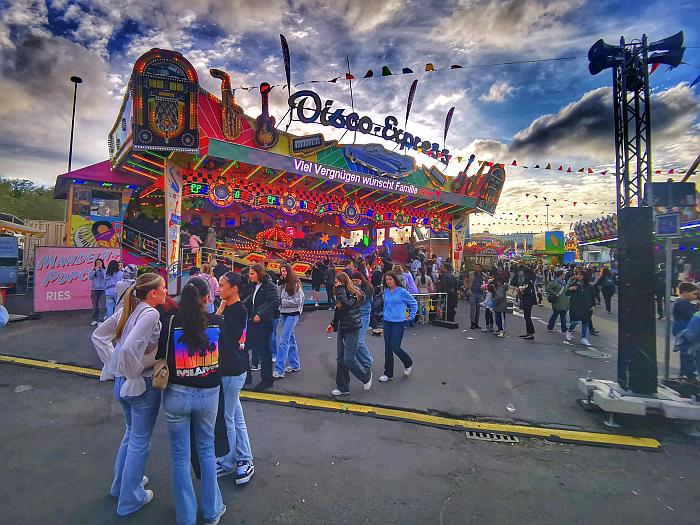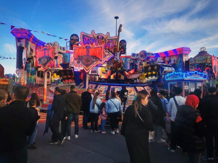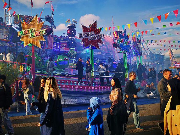 Auffällig ist, dass extrem viele Menschen mit Migrationshintergrund unterwegs sind, Menschen jeglichen Alters stehen an den Fahrgeschäften Schlange. Es ist quietschbund auf dem Gelände und ein Stimmengewirr allererster Güte. Das Riesenrad dreht gemächlich seine Runden, der Gladiator sorgt für Staunen und manchmal auch für Panik. Doch was ist das eigentlch? „Es handelt sich um eine Art Schwingkarussell, bei dem die Fahrgäste in Sitzen Platz nehmen, die an Armen aufgehängt sind. Diese Arme schwingen in alle Richtungen und drehen sich dabei um ihre eigene Achse. Gleichzeitig wird die gesamte Plattform, auf der die Sitze montiert sind, in die Luft gehoben und rotiert. Die Fahrt sorgt für ein intensives Gefühl der Schwerelosigkeit und rasante Beschleunigung, weshalb sie bei den Besuchern sehr beliebt ist. Die Fahrt ist bekannt für ihren Nervenkitzel und die hohe Geschwindigkeit …“ erzählt mir eine künstliche Intelligenz Naja. Im Grunde ist ein 60 Meter langer Arm, der sich um die eigene Achse dreht. An den jeweiligen Enden sind jeweils zehn Plätze, die sich zudem in alle Richtungen drehen. Ich möchte mal wissen, wieviele Handys dabei flöten gehen.