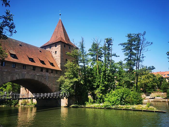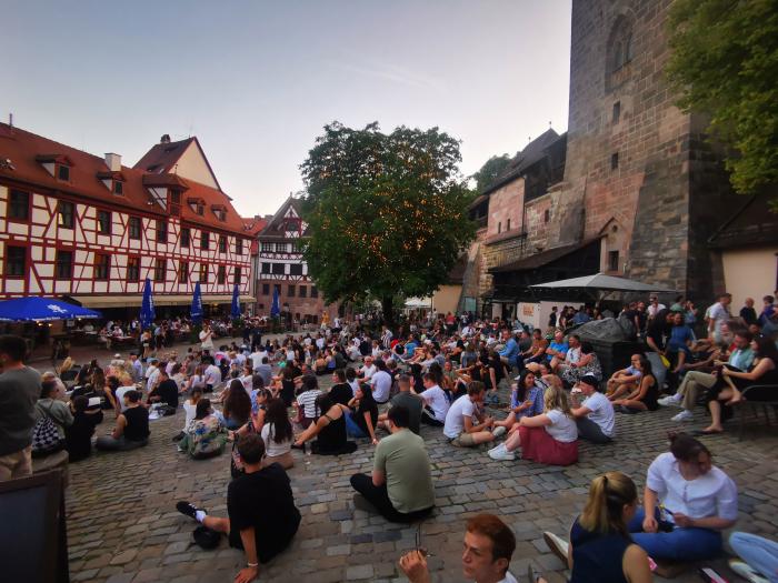 Der Wagenpark war längst geräumt, heute wird dort für die städtischen Bühnen gebaut. Doch mit diesem Ohrwurm im Kopf nahmen wir bei Gutmann am Dutzendteich einen Imbiss zu uns, tranken ein wunderbares alkoholfreies Bier von Landwehr-Bräu und fuhren mit der nächsten Bahn: erst zum Mahnmal gegen den Faschismus, dann in die Stadt, wo wir über das Ehekarussell staunten, um später an der Henkersbrücke einen Milchkaffee zu trinken. Auf den gegenüberliegenden Stufen ließ es sich trefflich chillen. Das dachte sich auch die Gang 16-jähriger Teenies und ließ Prosecco aus kleinen Flaschen kreisen. Unbeirrt floss die Pegnitz ihres Wegs. Abends wanderten wir nach dem Essen hoch zur Burg und blickten noch einmal über die Stadt. Am Fuß der Burg freuten sich Einheimische und Touristen bei einem fränkischen Bier des Daseins, das Stimmengesurre am milden Abend war vom Feinsten.