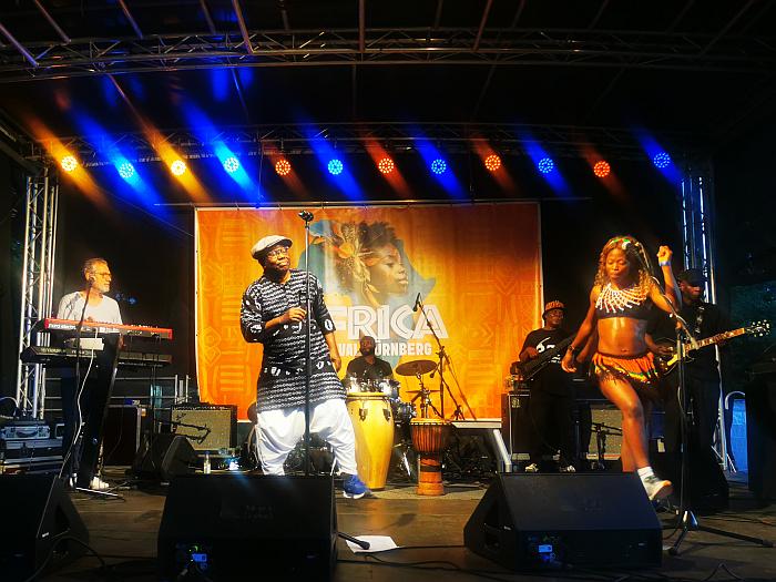 Letztes Jahr war ich ja schon einmal in Nürnberg, daher erinnerte ich mich an eine kleine Wirtschaft, die wir damals aufgesucht hatten und die uns trefflich bewirtet hatte. So auch diesmal – es war erstaunlich wenig los, aber sehr nett und lecker. Anschließend wollten wir mit der Straßenbahn zum Dutzendteich fahren, doch unterwegs fiel unser Blick auf ein Plakat mit dem Hinweis auf ein Afrika-Festival, und spontan verließen wir die Bahn. Wenig später ratterten wir in die andere Richtung zum Westfriedhof. Nach ein paar Metern Fußweg erreichten wir das Gelände unter der Theodor-Heuß-Brücke.