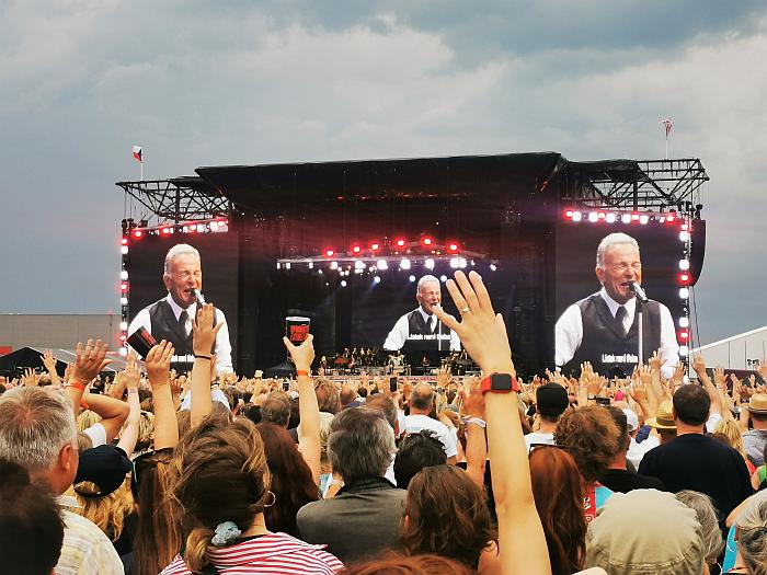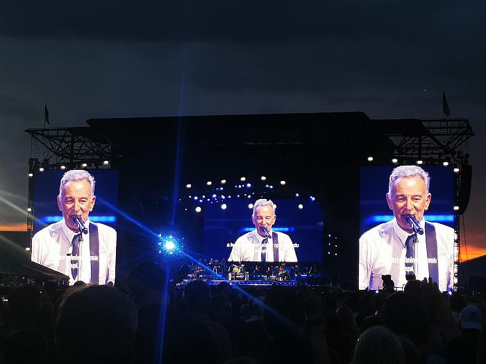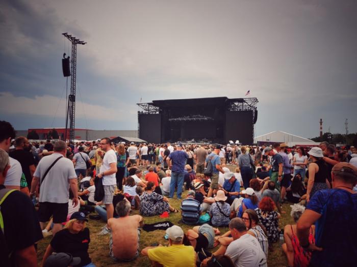Als es an der Zeit war, brachen wir auf zum Flugplatz Prag-Letňany – dem Ort, an dem heute Bruce Springsteen auftreten würde. Die Metro Linie C füllte sich ab der Station Muzeum zusehends – und die allermeisten Mitfahrenden hatten das gleiche Ziel. Wir folgten an der Endstation Letňany, für uns eher untypisch, dem Strom der Menge und erreichten nach wenigen Metern den Einlass zum Gelände, das schon ordentlich gefüllt war. Endlose Schlangen am Merch und an den Toiletten. Wie viele Besucher letztlich dabei waren, ist schwer zu sagen, aber es könnten um die 75.000 Menschen gewesen sein, die auf dem riesigen Gelände den Boss feierten. Wir hockten uns weiter hinten aufs trockene Gras mit schönem Blick auf die… Leinwand. Unablässig strömten die Menschen aus allen Richtungen auf den Flugplatz, füllten die Tribünen, die noch weiter von der Bühne entfernt waren. Die Sonne brannte.