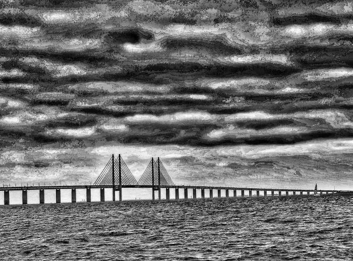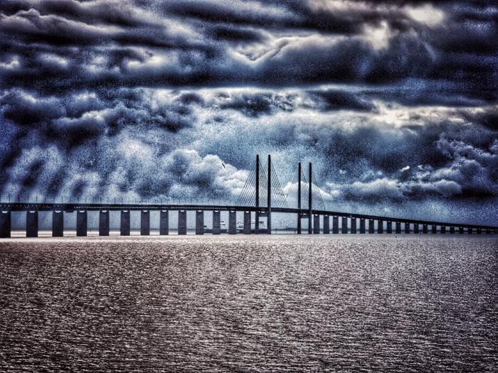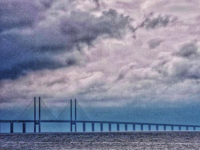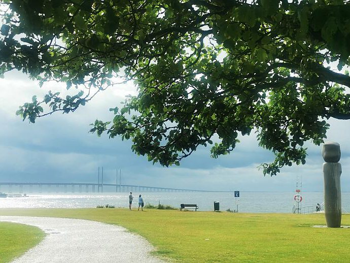 In der Nahverkehrsapp Skånetrafiken checke ich die Verbindung in Richtung der Öresundbrücke und stelle fest, dass es vom Platz unten eine direkte Verbindung bis zu einem Aussichtspunkt gibt, von dem der Blick ein schöner sei. So besorge ich mir ein 24 Stunden-Ticket für 64 schwedische Kronen und wandere vor zum Möllevångstorget. Dort nehme ich den 14er Bus und fahre durch Malmö, passiere ein Stadion, schaukel durch Vororte bis zur Strandengatan. Zwei Haltestellen vor der Endstation steige ich aus – und blicke auf den Öresund. Linker Hand zieht sich die Brücke mit den markanten Spitzen und verschwindet winzig klein im Wolkengrau der Ferne nahe Dänemark. Ein erhabener Anblick.