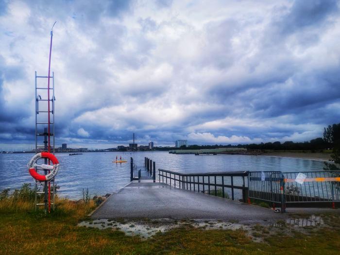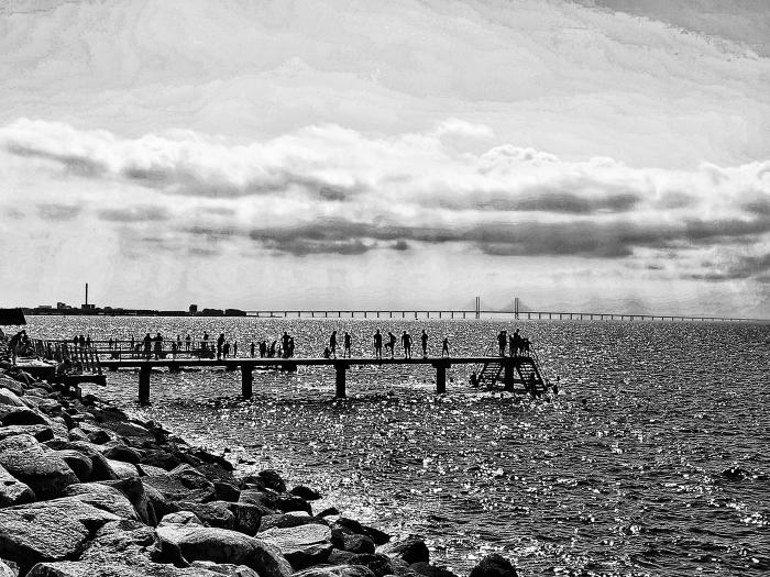 Immerhin finde ich nach einem kurzen Spaziergang einen ruhigen Platz auf den Steinen neben dem Weg – mit schönem Blick auf das glitzernde Wasser. Die Menschen auf dem Steg erscheinen als stumme Silhouetten, am Horizont zieht sich die Öresundbrücke nach Kopenhagen.