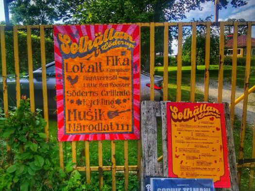 Der Ort ist wirklich überschaubar. Ein Auto überholt mich zögerlich – es scheint, als hielten die Insassen Ausschau nach der Location, die laut meinem Navi 300 Fußmeter von der Haltestelle entfernt liegen muss. Ich biege nach ein paar Metern in die nächste Straße ein, eher ein besserer Feldweg, der geradewegs ins Feld führt. Vor dem letzten Haus parken einige Autos. Ich laufe weiter und blicke auf ein schmiedeeisernes Tor mit Plakaten. Dahinter stehen zwei Männer an einem Holzkohlegrill, daneben ein alter Wohnwagen. Im Garten sitzen Menschen an Tischen. Ich habe Bullerbü gefunden.