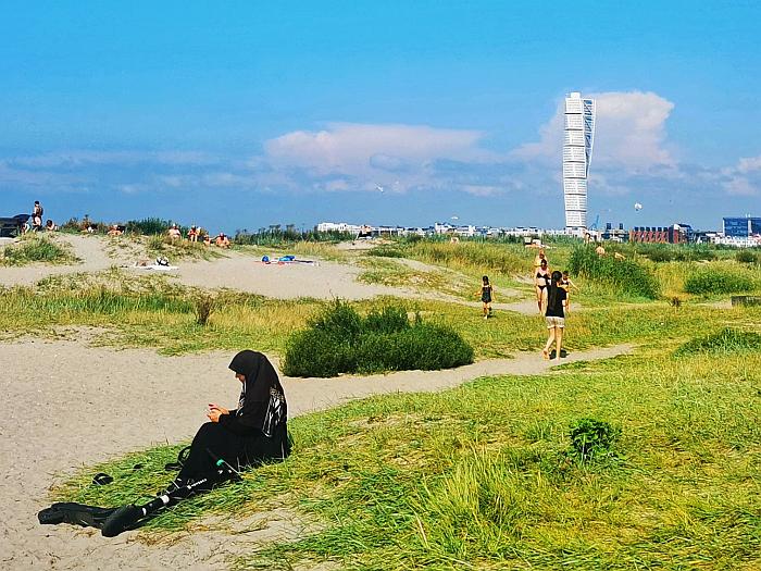 Am Abend habe ich zwei Möglichkeiten zur Auswahl. Einerseits könnte ich in den Park gehen und Alphaville lauschen – entweder vor der Absperrung oder jetzt für etwas über 30 Euro dahinter. Andererseits könnte ich auch noch einmal an den Ort fahren, wo am Dienstag alles begann – nah an der Brücke. Ich entscheide mich für Letzteres, nehme nach einem Imbiss den Bus und fahre wie neulich Richtung Campingplatz. Zwei Stationen vorher steige ich aus. Doch wo ich eben noch quasi allein unterwegs war, erweist sich diese Stelle am Ufer nun als Hotspot der muslimischen Community Malmös. In großen Gruppen sitzen Frauen mit Kopftüchern mit ihren Kindern beisammen, daneben die Männer. Von Zeit zu Zeit ziehen Qualmwolken und der Geruch von Gegrilltem über die Wiese.