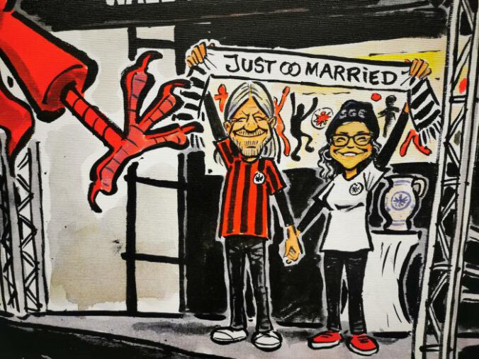 In den folgenden Tagen drehte sich der Sommer in den Herbst. Wenn ich Zeit hatte, besuchte ich meinen Vater, der mittlerweile durch einen Lendenwirbelbruch im Rollstuhl saß. Ansonsten hatte mich der Alltag im Griff. Ich besorgte die letzten Bilder für mein Büchlein, moderierte mit Pia die Waldtribüne und fuhr zu unmöglichen Zeiten ans Brentanobad, um die Eintracht-Frauen spielen zu sehen. Weiterhin ging ich brav zur TG Bornheim, pendelte zwischen Yoga, Fitness und Sauna und verfolgte die Champions-League-Spiele der Eintracht eher halbherzig. Leuchtende Momente waren die Konzerte von Xavier Rudd und Suzanne Vega oder einige Filme – darunter der neue Film von Christian Petzold, Miroirs No. 3, den ich mit Flo im Cinema sah. Mit dem Eintracht-Museum verlegten wir Stolpersteine für Max Loeb, wir fuhren in den Spessart, Francey gab ihr erstes Konzert und The Chameleons spielten im Bett. Ein ganz großes Geschenk bekamen wir von unseren Kolleg:innen aus dem Museum: Matze konnte Michael Apitz gewinnen, Pia und mich im Ambiente der Waldtribüne zu zeichnen. Wir waren zu Tränen gerührt. Dass der neue Asterix erschien – und in Portugal spielte, setzte dem Ganzen die Krone auf