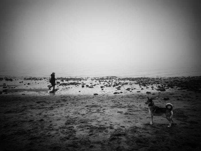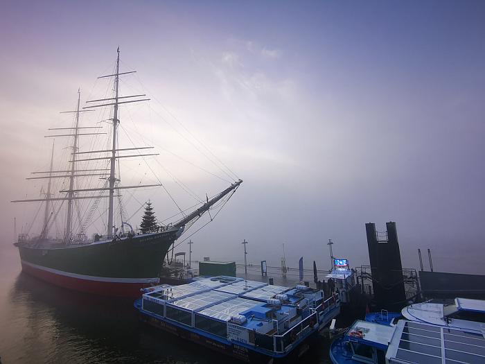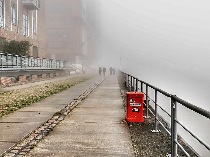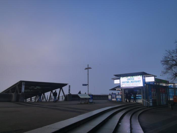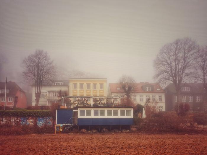 Am folgenden Morgen frühstückten wir in aller Herrgottsfrühe und machten uns dann mit der Bahn auf in Richtung Landungsbrücken. Dort stöpselte ich mir Kettcar ins Ohr und blickte von der Haltestelle … ins neblige Nichts. Es war eine magische Atmosphäre, du konntest kaum die Elbe sehen, geschweige denn die Elbphilharmonie oder die Containerkräne. Immerhin fuhr die Linienfähre Richtung Finkenwerder – ein gewagtes Unterfangen. Wir ließen uns am Oberdeck den Wind um die Ohren wehen, und alle Naslang dröhnte das Nebelhorn über den Fluss – so schipperten wir über die Elbe, vorbei am Fischmarkt und Övelgönne bis Finkenwerder und retour. In Övelgönne stiegen wir aus, die Ausflugsboote warteten auf besseres Wetter. Wir liefen am nebligen Elbstrand entlang und oben auf dem fast menschenleeren Fußweg vorbei an den alten Kapitänshäuschen zurück.