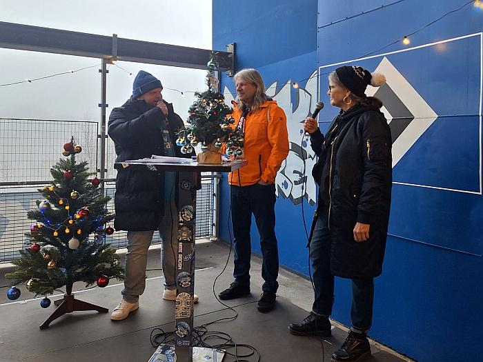 Uns erwartete vor dem Spiel ein Auftritt auf dem Hamburger Volksparkett, seinerzeit die Inspiration für unsere Waldtribüne. Von daher wurden wir mit Matze von Patrick vom Supporters Club abgeholt und in die Fanzone der Hamburger geschleust. Das Volksparkett ist im Umlauf vor der HSV-Kurve: ein kleines Podest, ein Weihnachtsbäumchen und ein ähnliches Programm wie bei uns. Vor uns erinnerten die Fans an den Tod von Ramazan Avcı, der vor 40 Jahren von HSV-Nazis ermordet wurde. Dann standen wir Rede und Antwort, und anschließend war Robert Glatzel zu Gast, der verletzungsbedingt nicht spielen konnte.