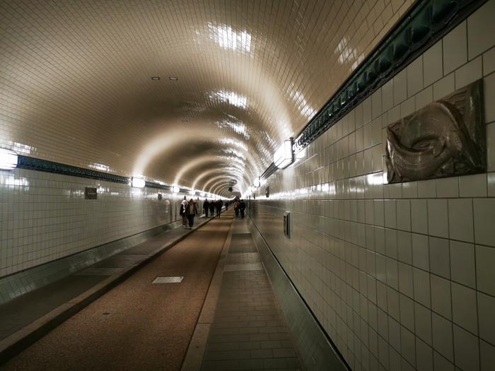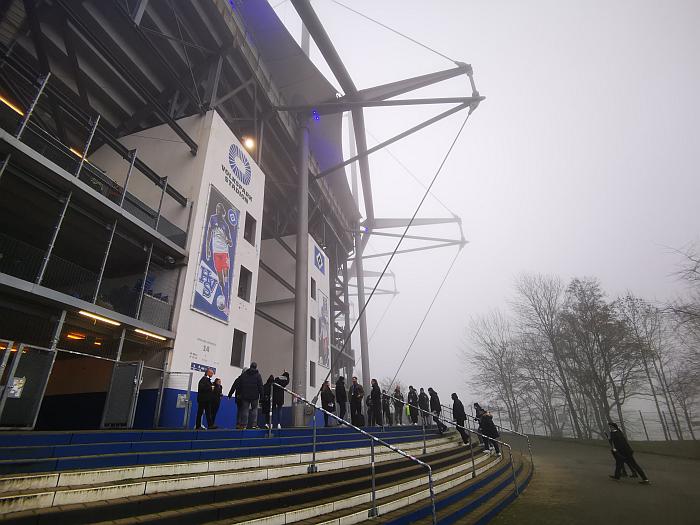 Anschließend nahmen wir den Bus an die Landungsbrücken (raus) – und spazierten nach einer kurzen Fahrt mit dem Aufzug in die Tiefe durch den alten Elbtunnel. Auf der anderen Seite gönnten wir uns ein Fischbrötchen und hatten die Möwen im Auge, der Blick prallte am Nebel zurück. Zurück auf der Hamburger Seite spazierten wir die Treppen hoch zum Ausgang und nahmen den Bus Richtung Volksparkstadion – welches nach einem kurzen Fußmarsch aus dem Nebel erwuchs.