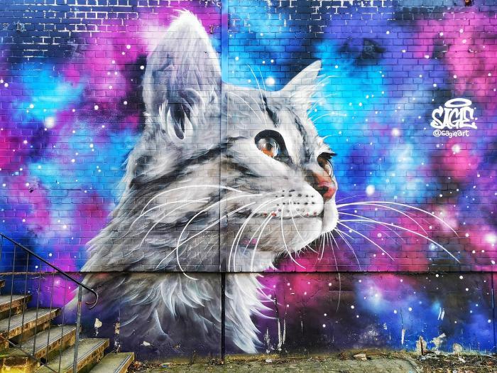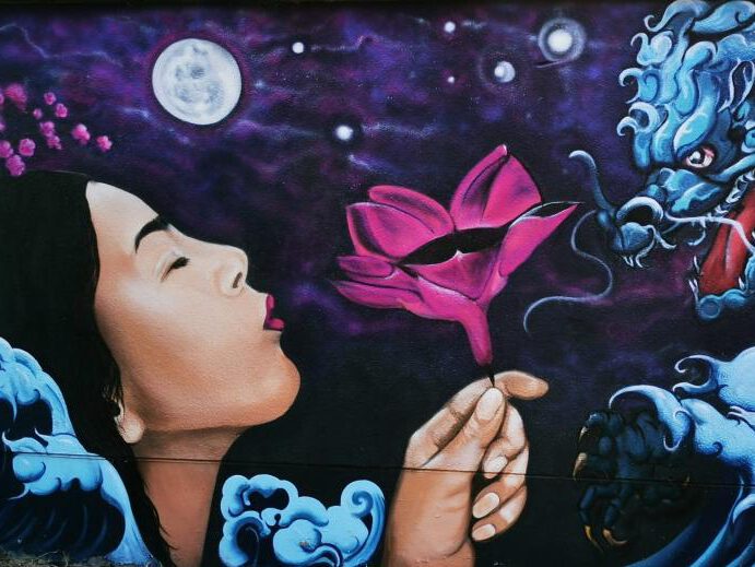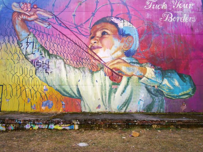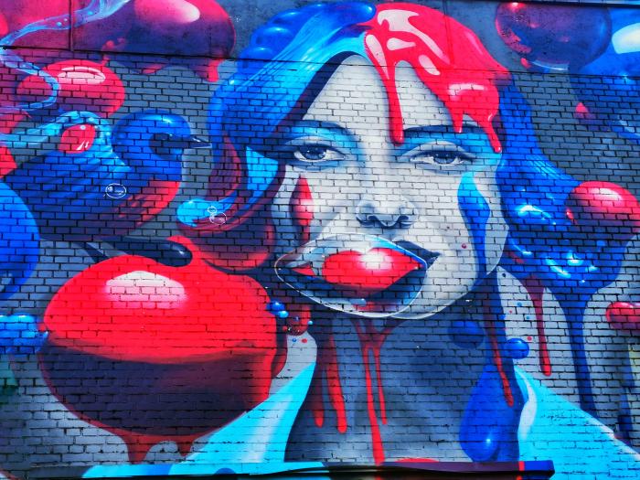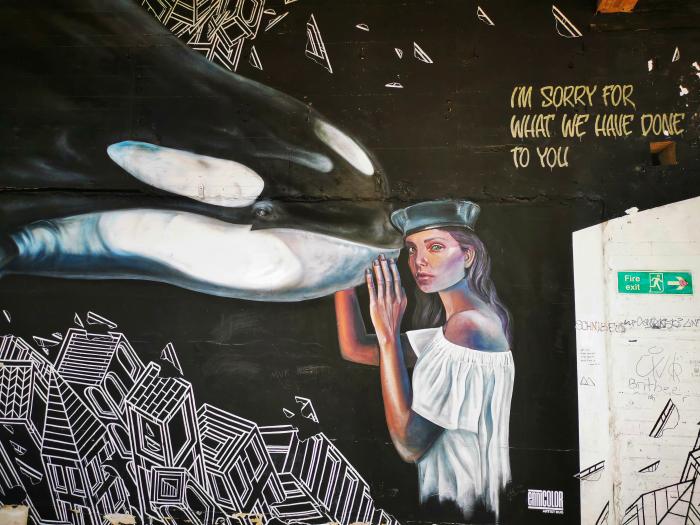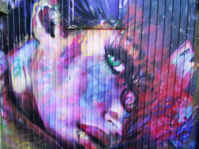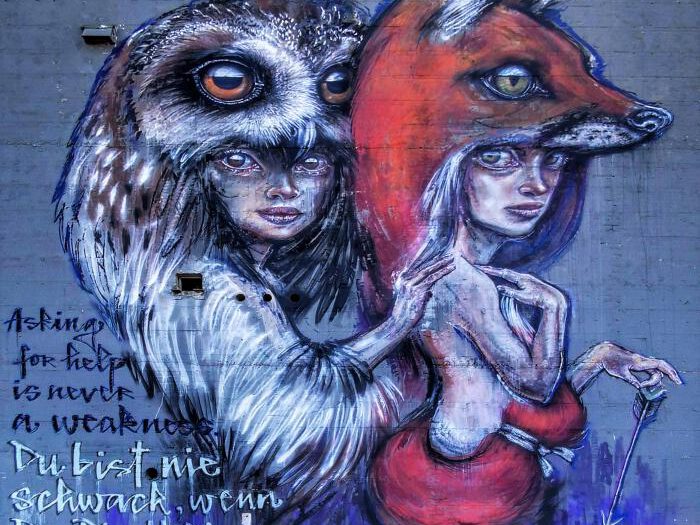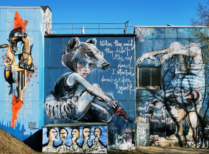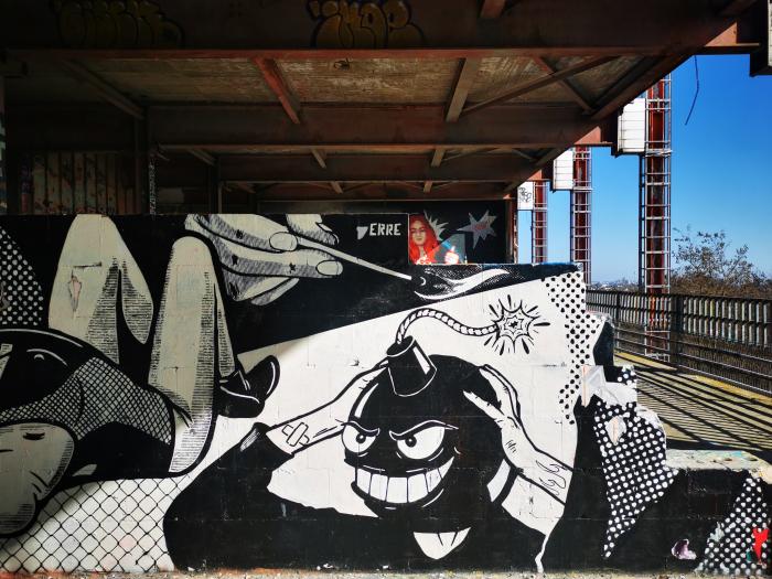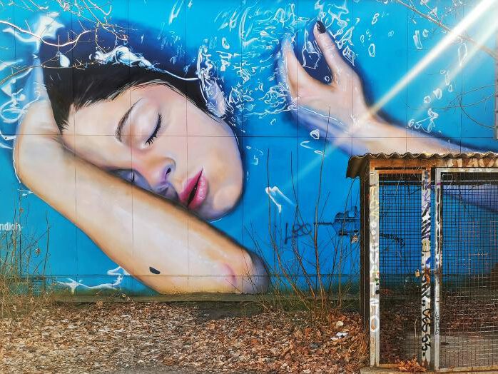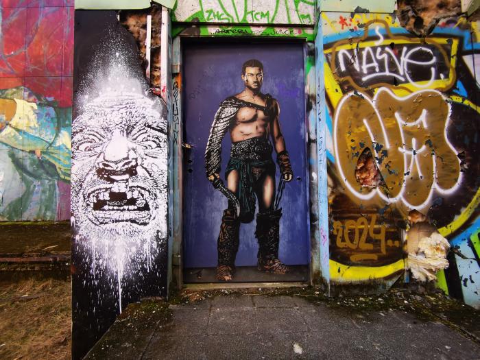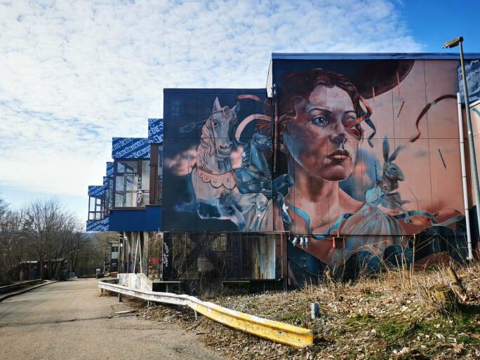 Heute beherbergt das Gelände eine Event-Location, eine Streetart-Gallery und ein Museum. Es werden Führungen angeboten, Sonnenstühle stehen vor einem mobilen Kiosk, und eine Schülergruppe durchstreift schnatternd die Wege. Es ist Mittwoch, die Anzahl der Menschen ist überschaubar. Und ja, du findest viele Fotomotive – gut, dass ich meinen Telefonakku noch im Zug aufladen konnte. Das großflächige Bild von  Hera oder Herakut erkenne ich noch aus dem Tatort, und tatsächlich: für mich ist es ein wahres Paradies zum Fotografieren. Über metallene Stufen kannst du von außen das einstige Hauptgebäude erklimmen. In den Etagen sind die Räume entkernt, die Wände bemalt. Die Schüler befinden sich auf einer Rallye, müssen einzelne Szenen entdecken und flitzen aufgeregt hin und her, neben mir schlurfen noch ein paar andere Flaneure durch die Räume.