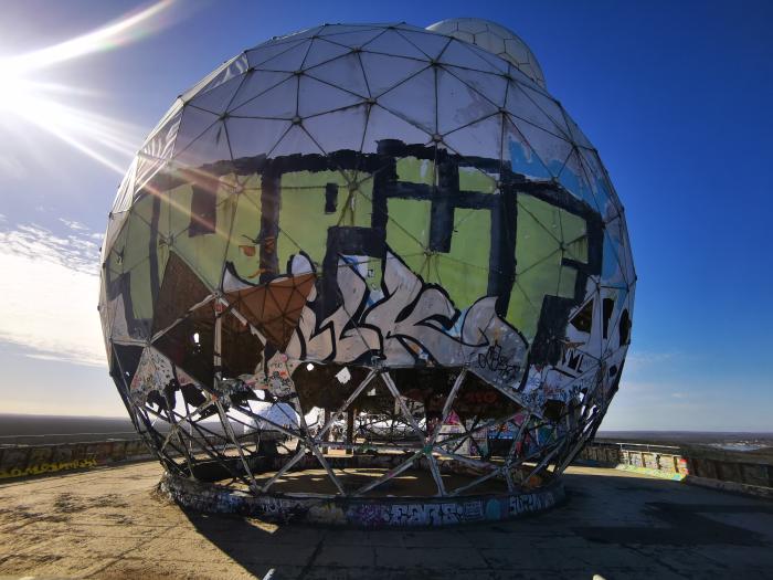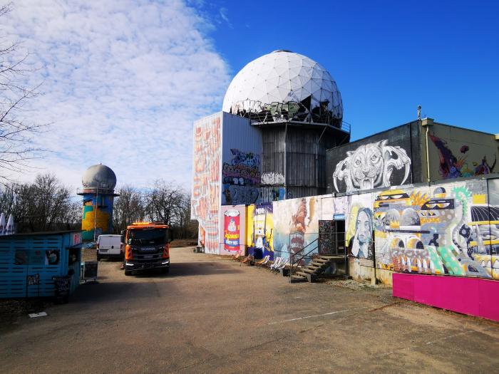 Die letzten Meter geht es stetig nach oben, immer wieder spitzen die auffälligen Kugelbauten durchs Astwerk. Und dann bin ich am Ziel. Ich höre Stimmen und sehe eine Menschengruppe hinter dem Zaun, der das Gelände umschließt. Es scheint also möglich zu sein, das Areal zu betreten. Als ich um die Ecke biege, sehe ich ein offenes Tor – aber auch ein Schild, das auf Eintritt hinweist, und einen Container, in dem eine junge Frau sitzt und kassiert. Auf die Idee, mich vorher genauer zu informieren, bin ich gar nicht gekommen. Ich dachte, ich entdecke einen Lost Place, finde ein Loch im Zaun und muss aufpassen, nicht erwischt zu werden. The last romantic in a dying world.