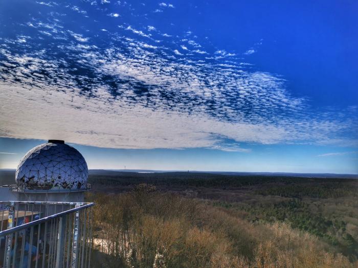 Oben auf dem Dach stehen die – nun mit teilweise zerschnittener Leinwand bespannten – Metallgerüstkugeln. Ein paar Liegestühle laden zum Entspannen ein, und du hast eine fantastische Übersicht über die Hauptstadt: hier liegt das Olympiastadion Berlin, dort der Fernsehturm am Alexanderplatz. Blau der Himmel – und ich frage mich, weshalb ich den Ort wie auch den Grunewald in all den Jahren bislang nicht entdeckt hatte.