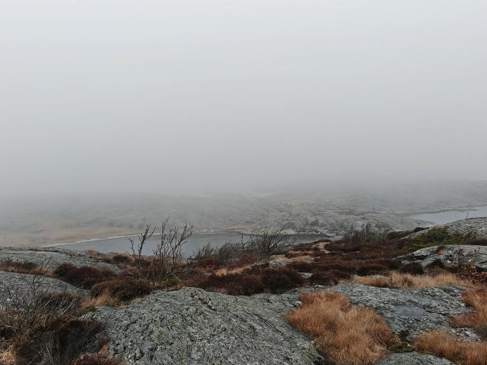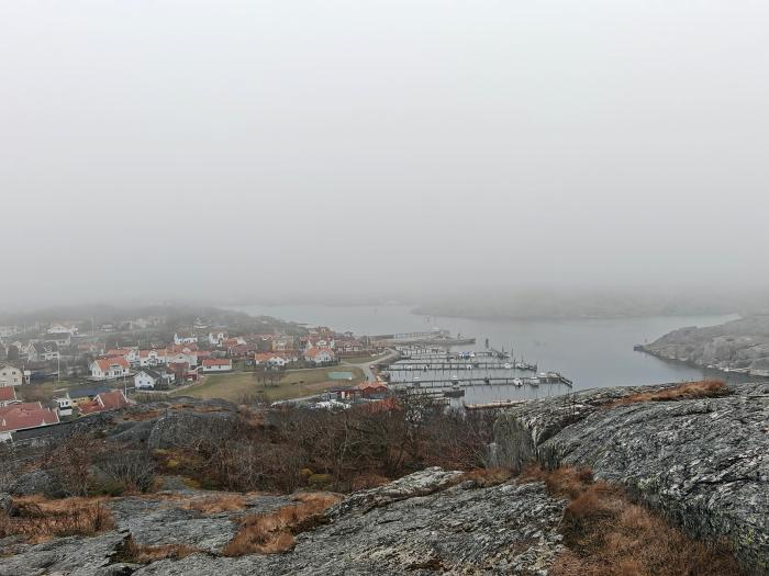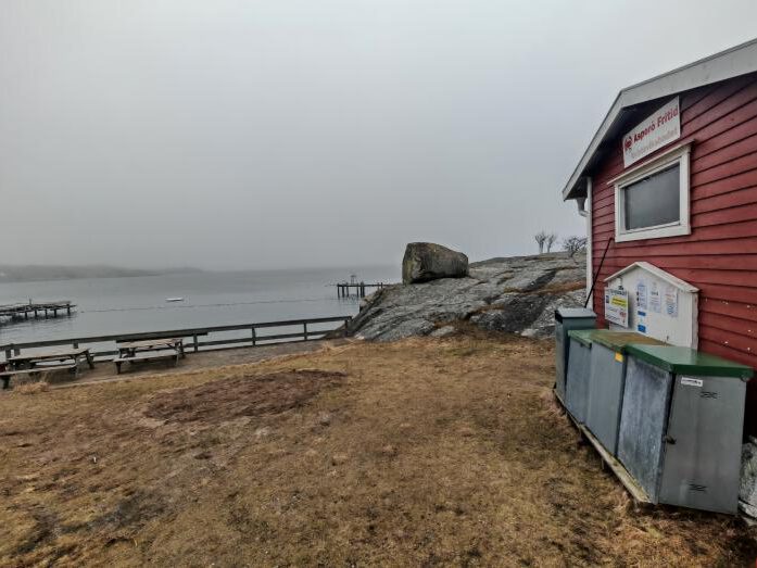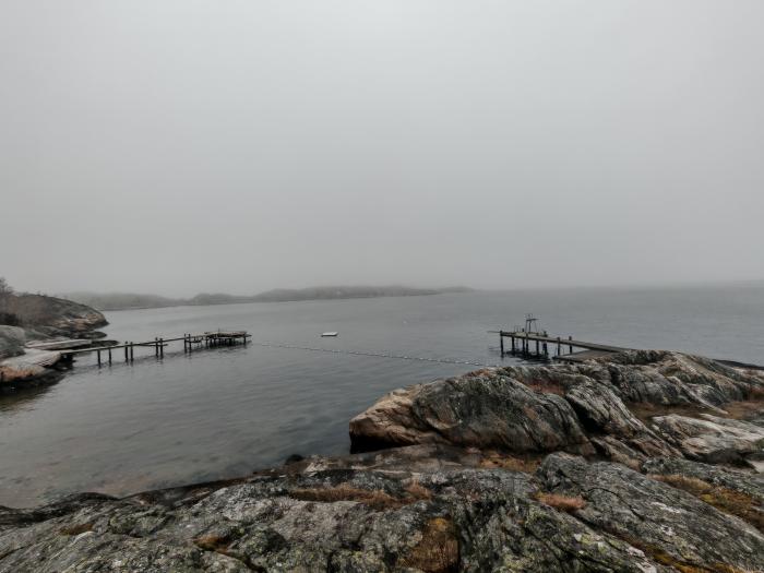 Nach einem Frühstück mit Kaffee und Zimtschnecke in der kleinen Bäckerei nehme ich wieder den Bus in die Stadt und fahre von dort mit der Linie 11 nach Saltholmen. Meine Fähre kommt in einer halben Stunde, ich drehe noch eine Runde durch den Hafen. Die Sonne vom Vortag ist nun einem diffusen Grau gewichen, es ist neblig. Als die Fähre ablegt, gehe ich ans Oberdeck und stelle mich alleine in den Wind. Eigentlich wollte ich nach Brännö, steige aber an der ersten Anlegestelle aus. Asperö Östra wirkt verlassen, fast aus der Zeit gefallen, kaum jemand verlässt die Fähre .