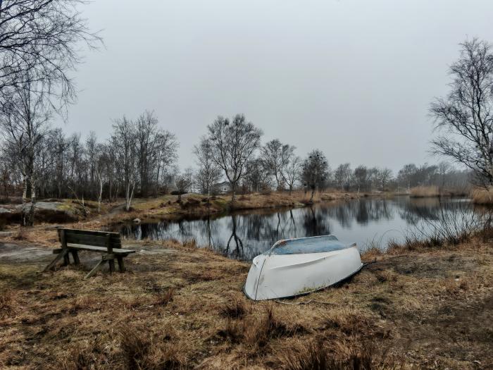 Auf den Ohren das neue Album von And Also The Trees, umgeben von Steinen, Hügeln, Birken und der nebligen See durchstreife ich die nahezu menschenleere Insel, wandere zu einem kleinen Badestrand mit Sprungturm, der verlassen auf den Sommer wartet, blicke in den Nebel und erreiche einen Aussichtspunkt. Unten liegt das Dorf, dahinter eine weitere Insel. Zwei Männer mit Hunden, ein See, ein Ruderboot am Ufer – viel mehr passiert nicht. Autos gibt es hier nicht, stattdessen Lastenmopeds mit großen Ladeflächen. Und einen zweiten Anleger: Asperö Norra.