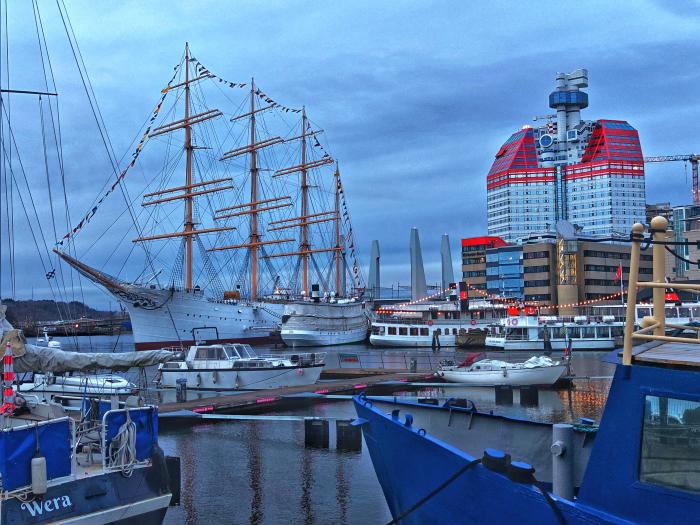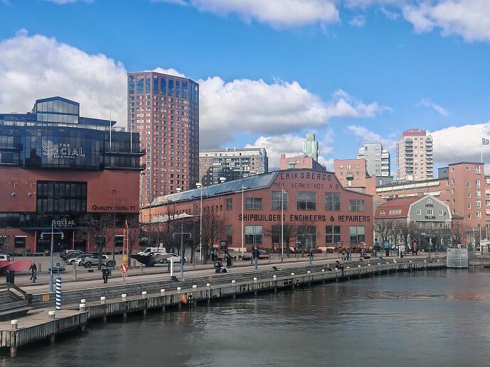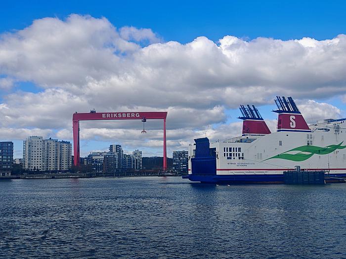 Brunnsparken sollte sich zu meiner Basis-Haltestelle entwickeln. Grundsätzlich gilt aber: Wenn du in einer Stadt nicht weißt, wo du hinwillst, geh an den Fluss. Und das gilt gerade für Göteborg, eine Stadt, die von Wasser durchzogen ist. Vorbei am Gustaf Adolfs torg schlängele ich mich über Baustellen ans Stenpiren, der Anlegestelle für Stadtfähren, und nehme eine kostenlose Fähre über den Fluss und zurück. Anschließend mache ich noch eine kleine Stadtrundfahrt auf dem Wasser. Die alte Werft ist schon lange stillgelegt, ein Kran mit der Aufschrift Eriksberg dient nun als Wahrzeichen, die Gegend scheint gentrifiziert.