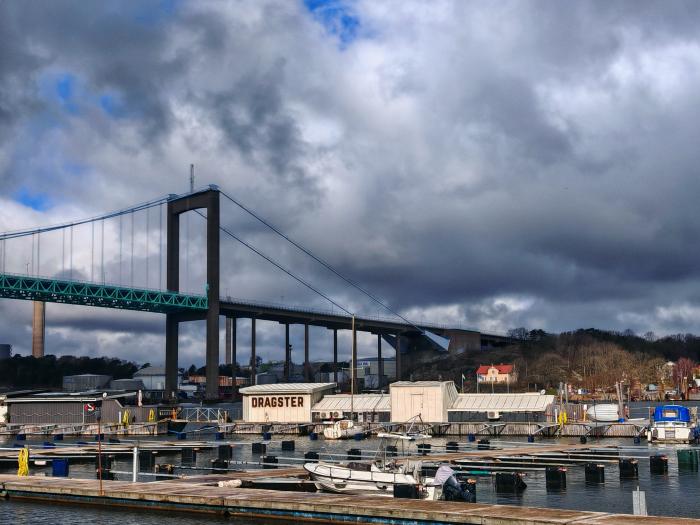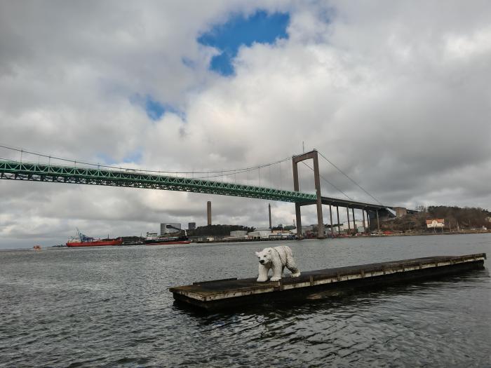 Immerhin sollte mein Flieger erst am Sonntagabend starten, so verblieben mir noch drei volle Tage in Göteborg. Freitag in der Frühe nehme ich wieder einmal die 11 Richtung Saltholmen, steige aber auf halber Strecke aus und lasse mich an den Fluss treiben. Dort führt ein Uferweg bis zur Röda Sten Konsthall unter der mächtigen Älvsborgsbron. Kurz dahinter biege ich ab und marschiere über ein weitläufiges Gelände neben dem Sjöbergen zur Straßenbahn. Erneut nehme ich die 11 bis Saltholmen, springe auf die Fähre und entere ein zweites Mal Brännö.