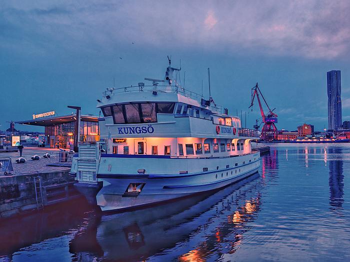 Der letzte Abend führt mich noch einmal auf die andere Seite des Flusses. Ich fahre bis Eriksberg und laufe von dort wieder durch die Abenddämmerung, bis mich die gleiche Fähre auf dem Rückweg wieder aufnimmt und nach Stenpiren bringt. Ein atmosphärischer und versöhnlicher letzter Abend neigt sich dem Ende entgegen.