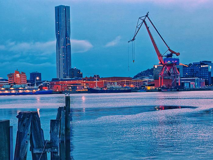 Abends treffe ich mich noch einmal mit Simone und wir nehmen am Stenpiren die Fähre auf die andere Seite. Von dort laufen wir in der anbrechenden Dunkelheit von der Technischen Fakultät an Kunstwerken vorbei bis nach Eriksberg. Gegenüber thront der Seemannsturm. Darauf wartet eine weibliche Skulptur, die „Frau am Meer“, auf die Rückkehr ihres seefahrenden Gatten – als hätte sie nichts Besseres zu tun. Andere Stimmen besagen, sie sei ein Mahnmal für die gefallenen schwedischen Seeleute des ersten Weltkrieges. Dass sie dabei nicht in Richtung des Kattegat blickt, verwundert.