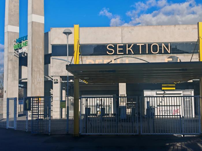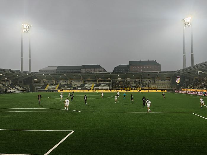 Gerade als ich mich zu Fuß zum Stadion aufmachen will, beginnt es zu regnen. Ich kehre um und warte an meiner Haltestelle mit Windschutz auf den 25er, der bald kommt und mich zum Wieselgrenplatsen bringt. Von dort sind es nur ein paar Meter bis zum Stadion, das heute „Nordic Wellness Arena“ heißt. Die Flutlichtmasten sehe ich jedes Mal aus dem Bus, wenn ich auf dem Heimweg bin.