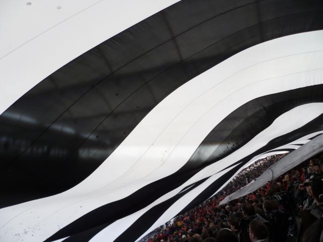 Während draußen Hunderte Eintrachtfans seitens der Polizei eingekesselt und abfotografiert wurden, bereiteten andere eine Chreographie vor, die sich gewaschen hatte – Eine schwarzweiß gestreifte Blockfahne wurde über die gesamte Kurve gezogen, an der Plexiabsperrung im Oberrang prangte zudem ein Banner mit der Aufschrift Nordwestkurve Sportgemeinde Eintracht Frankfurt. Nach dem Einrollen der Blockfahne zeigte sich die Kurve geschlossen in Rotschwarzweiß und einem Banner im Mittelrang: Wir werden euch den Teufel schon austreiben. Muss klasse ausgesehen haben, ich selbst stand ja mittendrin.