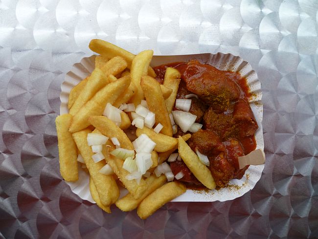 Wenig später ist die Wurst fertig. Sie lagert kleingeschnitten in einem Pappschälchen neben den Pommes, eine Serviette und einen Holzpiecker gibt’s dazu. Ungewöhnlich sind kleine Zwiebelchen in der Soße, aber der erste Blick ist ok, die Menge überschaubar. Nebenan plaudern die Crackies.