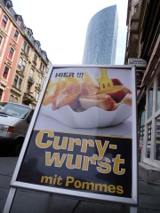 Curry Taunus 25 Hot & Spicy verkündet die Reklame. Zwei Stehtische warten auf uns, denn ich habe Pia in der Mittagspause abgeholt. Der Blick Richtung Stadtmitte zeigt die Altbauten auf der Taunusstraße und wandert an der ehemaligen Dresdner Bank und dem Skyper nach oben. Blauer Himmel. Nebenan vor der Pizzeria hocken die Crackjunkies auf dem Boden, ich ordere bei der freundlichen Bedienung eine Rindscurry mit Pommes, dazu ein Spezi und bezahle insgesamt 5,80 – ein klassischer Preis für ein klassisches Gedeck. Optional kann ich den Schärfegrad auf einer Skala zwischen 1 und 10 wählen. Auf meinen Hinweis, dass ich zwar gerne scharf esse, aber vom Rest der Wurst durchaus etwas spüren möchte, empfiehlt die Bedienung Schärfegrad 1. Dazu gibt es Zwiebel auf die Pommes. Ich finde ja den Popanz mit den Schärfegraden völlig überflüssig. Scharf oder nicht scharf, mehr braucht es eigentlich nicht. Brot hätte ich haben können, lehne ich aber dankend ab. Ihr wisst: Es ist das Brötchen, dass die Sache abrundet und nicht das Brot. Best-Worscht-Habitus allenthalben