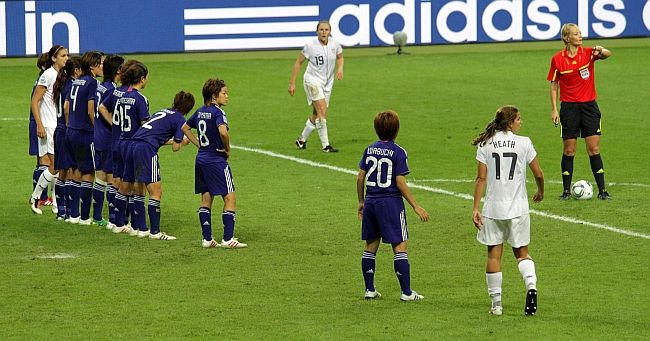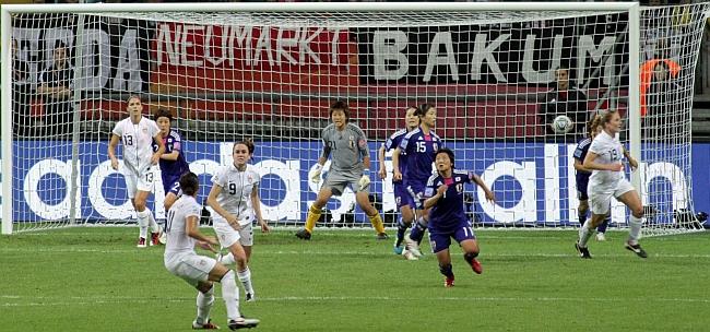 Die Amerikanerinnen, ganz in weiß (bloß die Torfrau trug gelb), begannen wie die Feuerwehr und setzten die Japanerinnen (in blau) mächtig unter Druck. Angeführt von Abby Wambach flog Ball für Ball auf das Gehäuse von Ayumi Kaihori, die hielt, was zu halten war und nicht in die Ränge flog – es schien nur eine Frage der Zeit, bis die USA in Führung ging.