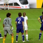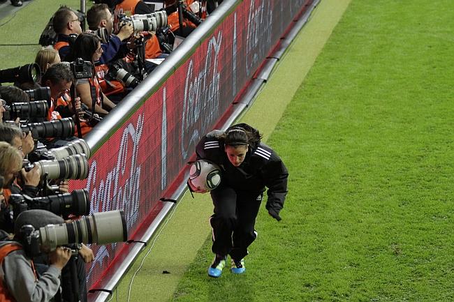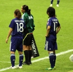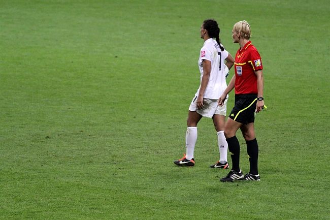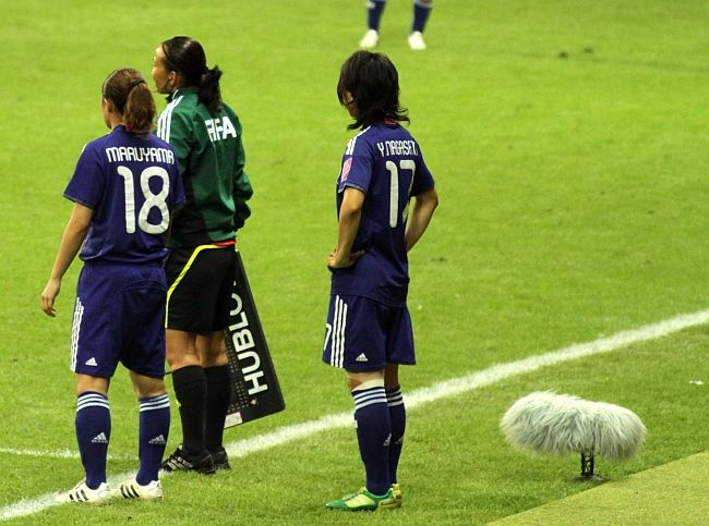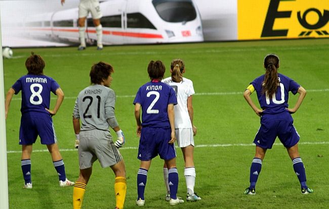 Japan, mit der bislang so starken Homare Sawa bekam bis zur Halbzeit kein Bein auf den Boden, fing sich aber auch keinen Treffer ein, Glück, eine sichere Torhüterin (wann konnte man dies in maskuliner Form zuletzt von der Eintracht sagen) und eine vielbeinige Abwehr mit der ballsicheren Aya Sawashima verhinderten einen Rückstand, über den sich bis zum Pausenpfiff der Schiedsrichterpolizistin Bibiana Steinhaus im roten Sweater niemand hätte beklagen können.