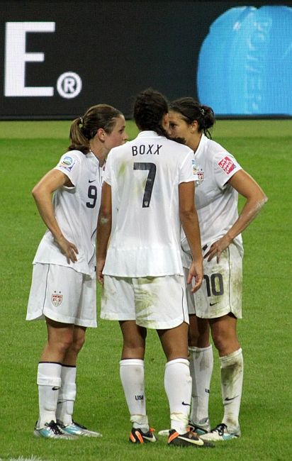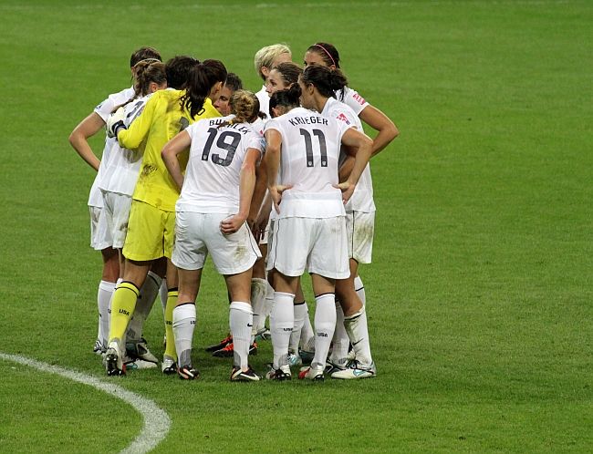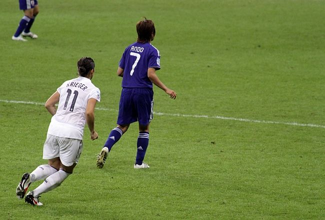 Auf dem Rasen dominierte die USA . Japan kam nicht dazu, das bekannte Kombinationsspiel aufzuziehen, kaum kontrollierten sie den Ball, da rollte auch schon die nächste Welle der Amerikanerinnen, deren Nummer 11, Alex Krieger, bis zum Sommer für den heimischen 1.FFC Frankfurt gespielt hatte. Krieger – welch ein Name für einen Fußballer oder besser für eine Fußballerin.