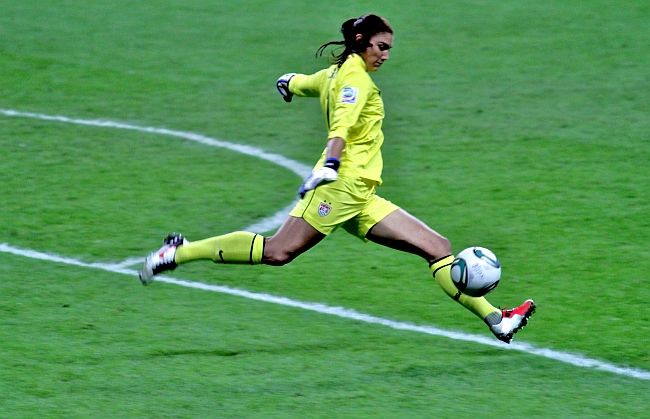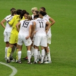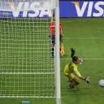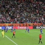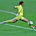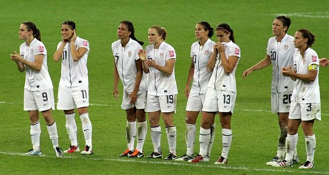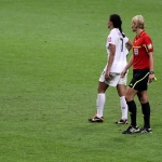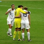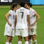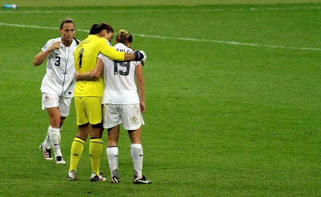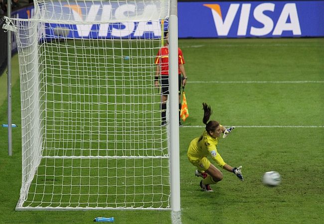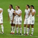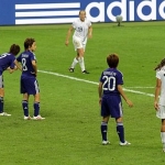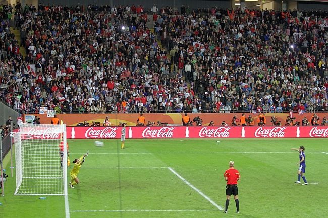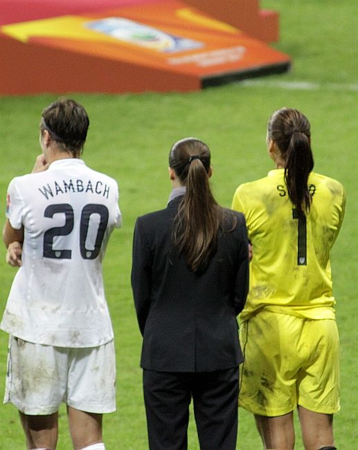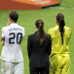 Hope Solo agierte weiterhin auf unserer Seite und sie erlebte mit uns kurz vor dem Seitenwechsel die erneute Führung ihres Teams; Abby Wambach hatte wie schon in den vergangenen Partien mit eisernem Willen getroffen. Das Verschnaufen in der Pause währte jedoch nur kurz, Frau Steinhaus trieb regelgerecht zum Weiterspielen an und mit jeder gespielten Minute schien der Titel für die USA greifbar nahe. In der 114. Spielminute wurde die auffällige Rapinoe ausgewechselt, in der 117. Spielminute lag bei den Anhängern der Amerikanerinnen blankes Entsetzen in der Mimik , als Frau Solo die Kugel tatsächlich zum zweiten Mal aus dem eigenen Netz holen musste. Wer sonst als Homare Sawa hatte den kaum noch für möglich gehaltenen Ausgleich erzielt. Wenige Sekunden vor Schluss zog Alex Morgan zielstrebig dem 3:2 entgegen, wurde knapp vor der Strafraumkante von Iwashimizu gelegt, die daraufhin mit Rot vom Platz musste. Der fällige Freistoß aber fand nicht den Weg ins Ziel und somit endete die Partie vorerst mit 2:2. Elfmeterschießen.