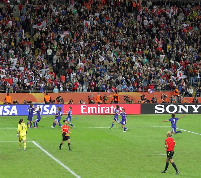 Zunächst schien sich die grausamste aller Entscheidungen beim Fußball, sieht man einmal vom Münzwurf ab, zu unserer Enttäuschung vor der Nordwestkurve abzuspielen, Jubel brandete auf der dortigen Tribüne auf, bis klar war: Es wird auf das Tor im Osten geschossen, direkt vor unseren Augen. Boxx lief an und Kaihori flog in die richtige Ecke, zog blitzschnell den Fuß nach oben und hielt das Ding, während Solo gegen den Schuss von Miyama machtlos war. Überhaupt war das Verhalten der amerikanischen Torhüterin bei Elfmetern interessant: Sie entschied sich schon in der Gewichtsverlagerung für eine Ecke; flog die Kugel dorthin, war sie schnell dort; zielte die Schützin jedoch in die andere Ecke, brauchte sie sich nicht zu werfen, sie hatte ohnehin keine Chance. Mit dieser Variante konnte sie auch die Elfmeter im Viertelfinale gegen Brasilien halten. Heute jedoch ward ihr kein Glück beschieden, obgleich sie ihr Team mit der Parade gegen Nagasato im Spiel hielt, nachdem Loyd den Ball in die Luft gejagt hatte. Da auch Heath an Kaihori scheiterte und Abby Wambach als einzige für die USA traf, während sich Samaguchi keine Blöße gab, lag der Ball für Kumagai parat. Trifft sie, ist das Spiel entschieden. Sie lief an, Solo flog in die richtige Ecke, hatte jedoch gegen den hoch geschossenen Ball keine Chance. Tor, Sieg und Titel für Japan, das nach Deutschland und Schweden nun auch den dritten Favoriten aus dem Turnier gekegelt hatte. Die Spielerinnen flitzen über den Rasen, während die Amerikanerinnen die Köpfe hängen ließen.