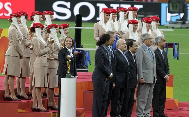 Emsig wurde die Bühne für die Siegerehrung aufgebaut, die von Damen erklommen wurde, die aussahen wie die Stewardessen einer königlichen Airline. Dann wurde die Prominenz aufs Spielfeld gebeten – Namen wurden keine genannt, doch allen war klar, dass neben Steffi Jones auch Fifa-Präsident Josef „Sepp“ Blatter zu dieser gehörte und so gellten lautstarke Pfiffe durchs weite Rund. Welch ein Armutszeugnis für den bescheidenen Mann, der die WM im Männerfußball für das Jahr 2022 ganz uneigennützig an die Fußballgroßmacht Katar vergeben hatte. Pfiffe gellten auch, als die nicht anwesende Marta mit dem bronzenen Ball für die drittbeste Torschützin geehrt wurde. Dies wiederum irritierte mich.