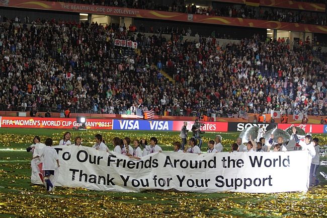 Als die Japanerinnen den goldenen Pokal aus den Händen von Steffi Jones in Empfang nahmen, flogen aus Konfettikanonen Milliarden von goldenen Schnipsel in die Luft und die Mädels hüpften im Blitzlichtgewitter vor Freude auf und ab; dies hatten sie sich redlich verdient. Technisch ausgereift kam der Fußball daher, bissig und freundlich zugleich hatten sie sich in die Herzen der Zuschauer gespielt – und der Titel mag Balsam auf das durch den Tsunami gebeutelte Land sein, abgesehen vom Gegner gab es wohl niemand, der ihnen den Titel nicht gegönnt hätte.