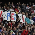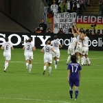 Nachdem wir eine Weile die Ränge beobachtet hatten, erkannten wir am Rande der Haupttribüne einige freie Plätze und wanderten schnurstracks dorthin – und von nun an verfolgten wir das Spiel nur wenige Meter von dem Rasen entfernt, auf dem die Eintracht noch vor wenigen Wochen dilletiert hatte. Glaubt mir, was wir heute sahen, war um Längen besser als alles, was wir im Jahr 2011 hier gesehen hatten. Auch weil nur wenige Reihen hinter uns das Team Schweden saß.