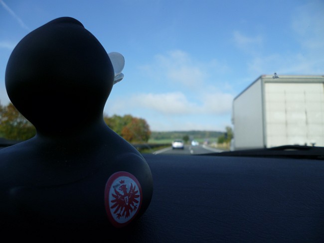 Die Eintracht brachte den Vorsprung souverän über die Zeit, einzig die mangelnde Torausbeute gilt es zu kritisieren aber immerhin: nach dem elften ungeschlagenen Spiel in Folge stand der Sprung auf Platz Eins in der Tabelle. Die Fans feierten ihre Helden noch eine halbe Stunde nach Abpfiff – wir freuten uns mit und verließen das Ruhrstadion mal wieder mit lachenden Augen. Der Hunger trieb uns noch einmal Richtung City, während an uns etliche Polizeiautos mit Blaulicht vorbei rauschten. Nach einem unfreiwillig langen Spaziergang, der uns am alten Stadtpark vorbei führte, landeten wir gegen 21:30 Uhr wieder am Golf, der noch brav die Stellung gehalten hatte und zur Musik von WDR2 mit Jefferson Airplane (White Rabbit) und The Lovin‘ Spoonful (Summer in the City) sausten wir über die nächtliche Autobahn Richtung Heimat. Trotz etlicher Baustellen kamen wir gut durch, erst gegen Ende der Fahrt kroch die Müdigkeit in mir hoch, doch da parkte der Golf schon im Nordend und wir waren wieder zuhause: Die Pia, der Golf, die Eieruhr und ich. Auswärtssieg!