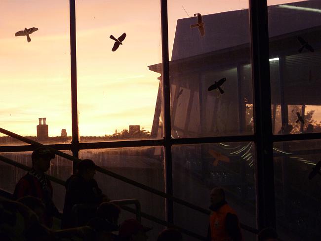 Das Schöne an Auswärtsspielen ist ja auch, dass man eine Menge Eintrachtfans trifft, die allesamt tolle Geschichten im Gepäck tragen. Wir trafen Harald, der schon seit den Sechziger Jahren die Eintracht begleitet und sich für all das Geld wohl auch ein Einfamilienhäuschen hätte zulegen können, wir trafen auf Werner aus Stadtallendorf, die wie immer mit vollbesetztem Bus anreisten und auf viele andere Verrückte, die bei Wind und Wetter der Eintracht hinterher reisen. Bald traf auch Marc ein, und mit ihm eine der beiden Eintrittskarten. Glücklicherweise traf ich René dessen Kumpel meine zweite Karte im Auto nach Bochum bringen sollte – dabei stellte sich heraus, dass diese zweite Karte soeben verkauft wurde. Ein Rückruf bestätigte dies. Pia wirkte kurzzeitig recht unglücklich, aber schon griff Dino, der neben uns stand, zum Hörer, doch noch ehe er telefonieren konnte, meinte eine Stimme hinter uns, dass es manchmal ganz praktisch sei, ein Telefonat unfreiwillig mitzuhören, denn er habe noch eine Karte, die schnurstracks in Pias Besitz überging. Somit war alles gut und wir enterten den Block. Noch waren jede Menge Leute unterwegs, so dass wir locker nach oben marschierten, ordentlich Platz hatten und eine gute Sicht dazu. Trotz halbstündig verspätetem Anpfiff trudelten die letzten erst gegen Ende der ersten Halbzeit ein, da konnten wir schon zwischen Stadiondach und den Sitzen einen prächtig verfärbten sonnenuntergehenden Herbsthimmel beobachten, derweil die Eintracht mit 2:0 führte.