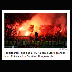 Nachtrag: Der Text wurde stillschweigend geändert, so wurden aus den bösen Frankfurter Randalierern nun Fans des 1.FC Kaiserslautern. Das Bild blieb das gleiche. Wenn wir noch ein wenig warten, werden daraus noch tolle stimmungsvolle Mainzer.