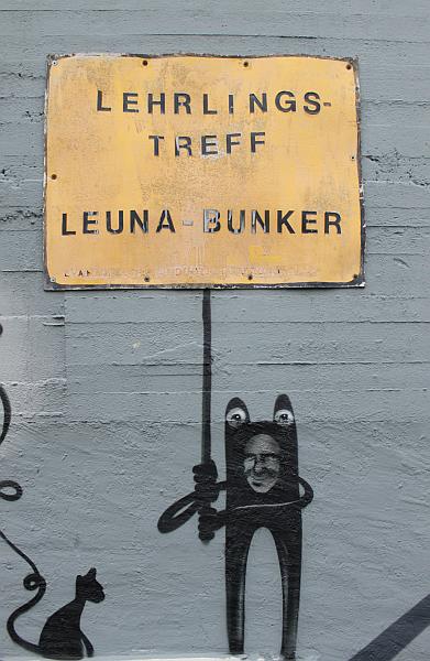 Wer in Frankfurt unterwegs ist, der findet an allen Ecken Seltsamigkeiten, einer der vieles davon festhält ist das stadtkindFFM, oft gibt es zu den Erscheinungen noch Hintergründiges und Informatives dazu. Neulich konnte man bei ihm Bilder des Leunabunkers in Höchst entdecken, der von Bomber und Co bearbeitet wurde. Bemerkenswert dabei ist, dass ich zur gleichen Zeit nur ein paar Meter davon entfernt zu tun hatte und mehrfach an jenem Bunker vorbei gefahren bin. Da die Vorderseite auf den ersten Blick nur wenig aufregendes zu bieten hat, schenkte ich dem Teil kaum Beachtung – erst durch Stadtkinds Fotos motiviert sah ich mir das Gelände genauer an. Die Arbeiten sind einfach großartig. Hier sind nun ein paar Fotos davon von meiner Seite: