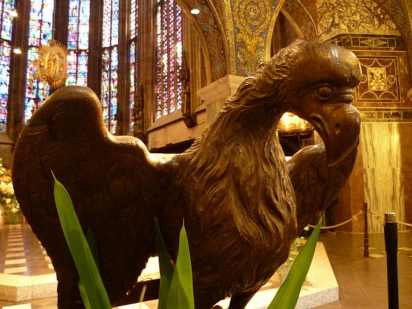 Ein Road-Schöppchen, eine kleine Stärkung auf dem Weg zum Dom. Massives Polizeiaufgebot. Wegen uns? Nein, die Bundeskanzlerin spricht im Rahmen des NRW-Wahlkampfes justament heute in Aachen. Soll sie doch. Mächtig wuchs der Dom in die Höhe, gegenüber des Platzes thront ebenfalls das imposante Rathaus und unser Kulturprogramm führte uns natürlich in den Dom. Filigrane Fensterverglasung, Fresken und Mosaike beeindruckten uns ebenso, wie die Kerzlein, die das ewige Licht leuchten; Pia entzündete eins für Ralf, Marc eines für den Aufstieg – und mitten im Dom blickte uns ein Steinadler entgegen. Oder besser: Ein Adler aus Stein. Ein Zeichen.