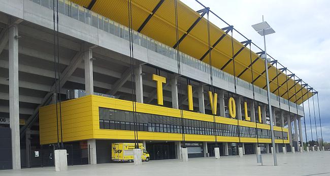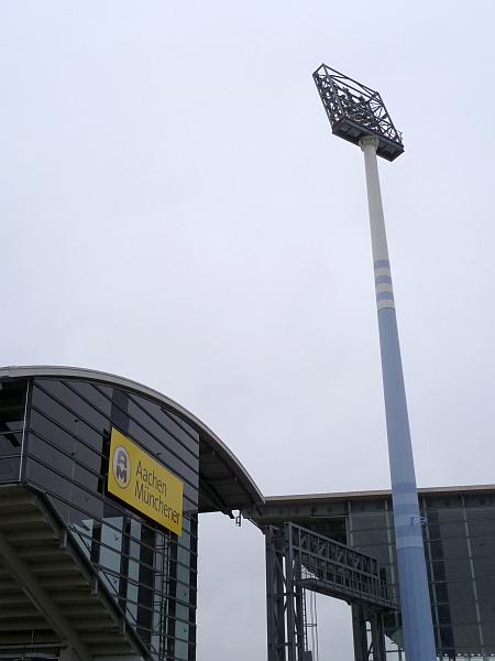 In der City, die durch den zweiten Weltkrieg schwer zerstört wurde, reihten sich Nachkriegsbauten recht uninspiriert an die verbliebenen Altbauten, Printen gabs an jeder Ecke, ebenso Kirchenschnickschnack – wir aber zogen los, um zu finden, und wir fanden: Eine freundliche Gaststätte zwischen Rathaus und Uni, das Cafe Anvers; Schnitzel für 6,50, Leffe-Bier und Raucherraum. Hier verrann die Zeit und ehe wir uns versahen, marschierten wir schon hoch zum Stadion. Leuchtend gelb glänzte der Tivoli in den Tag, in dem die Anzahl der Regentropfen bislang an einer Hand abzuzählen waren. Nebenan verwitterte der alte Tivoli, von dem die Aachener mit glänzenden Augen erzählen. Alles hat seine Zeit. Und vergeht.
