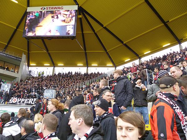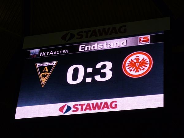 Die Aufstellung der Eintracht überraschte insofern, als dass Hoffer vorerst nur auf der Bank Platz nahm, Idrissou hielt zunächst die Stellung im Sturm alleine. Aber da waren ja noch Köhler und Kittel. Und natürlich Alex Meier. Wenig überraschend übernahm Matthias Lehmann die Position von Pirmin Schwegler. Bei Aachen fand sich Auer zunächst auf der Bank wieder; Albert Streit spielte ebenso wie David Odonkor von Beginn an – und die Alemannia brauchte einen Sieg, um noch einen Gedanken an den Klassenerhalt denken zu dürfen. Entsprechend mutig gingen sie zu Werke, spielten munter nach vorne; Torchancen jedoch gab es so gut wie keine. Aachens Kurve glaubte an die Möglichkeiten, die Stimmung war giftig, aber Fußball.