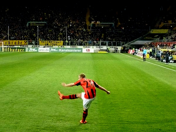 Bei Aachener Ecken wurde gewissenhaft gepöbelt, wir aber mussten uns zurück halten; wer weiß, ob die TV-Kameras erneut auf uns draufhalten würden. Die Ecken aber brachten nichts ein, und so dauerte es bis kurz vor der Halbzeit, bis ich die Arme hochriss und Toooor brüllte. In dem Moment war ich ziemlich einsam, murmelte ein: Ey wir führen in die Runde und dann hatten es alle begriffen – Toooooor für die Eintracht, irgendwie hatte Idrissou die Kugel ins Netz gebracht. Nie mehr zweite Liga. Auf den Stehblöcken flammten Bengalos und Rauch auf, und ich schwankte gedanklich zwischen: Scheißegal und ihr Kasper – bis tatsächlich eine Fackel über die Köpfe der Fans und Fotografen auf das Spielfeld flog und dort leuchtete. Scheiß auf eventuelle Geldstrafen und Spendenverlust – aber allein die Tatsache, dass durch diesen Wurf die Verletzung etlicher Unbeteiligter in Kauf genommen wurde, ist an Dummheit nicht zu überbieten. Wie toll war das Spiel in Berlin, wir euphorisch der Kick gegen Aue – und nun wieder das Gehassel, das vielen Leuten die Stimmung verhagelt. Halbzeit. Stefan vom Blog-G war sauer; völlig zu Recht: Er ist einer von denen, die uns Woche für Woche mit tollen Fotos beglücken – und läuft dafür Gefahr, ne Fackel ins Genick zu bekommen.