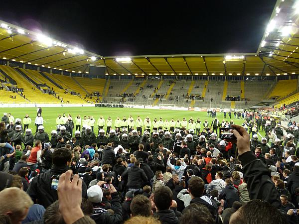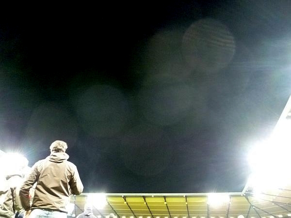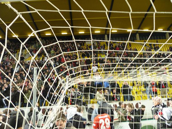 Eigentlich hatte ich einen Platz in der 26. Reihe, Sitzplatz diesmal, weil ich vergessen hatte meine Stehplatzkarte rechtzeitig zu bezahlen und mit der FuFa gefahren bin. Doch dort oben konnte ich es nicht aushalten, also bin ich schon in der 1. Halbzeit runter und so auf Renes Bilder geraten.