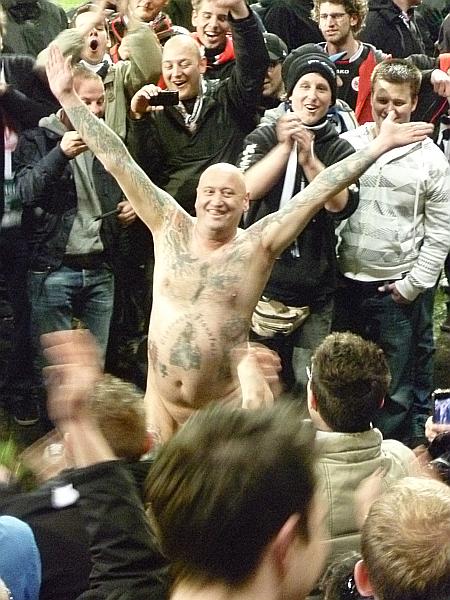 Irgendwann wurde der Sportdirektor auf den Schultern der Fans durch die Gegend getragen und ich dachte mir, dass dies jetzt irgendwie der falsche ist. Und nach einer gefühlten Ewigkeit, kam die Mannschaft um Trainer Armin Veh. Diese tanzte hinter den Polizisten und warf den Trainer in die Luft, während das Gros der Fans auf der anderen Seite der Kette stand, es war schon ein kurioses Bild. Die Badeschlappen der Spieler flogen in die Menge, nie mehr zweite Liga, Sebi Jung hüpfte und Alex Meier wurde wie Armin Veh oder Nikolov lautstark gefeiert. Die Sitze im Stadion aber hielten keiner Belastung stand, da sind selbst die Schalen in Frankfurt stabiler. Ein weiterer Höhepunkt folgte jedoch noch für die Übriggebliebenen. Adi, unser Adi schenkte uns einen Auswärtsstrip – und da mussten selbst die Herren in Grün lachen.