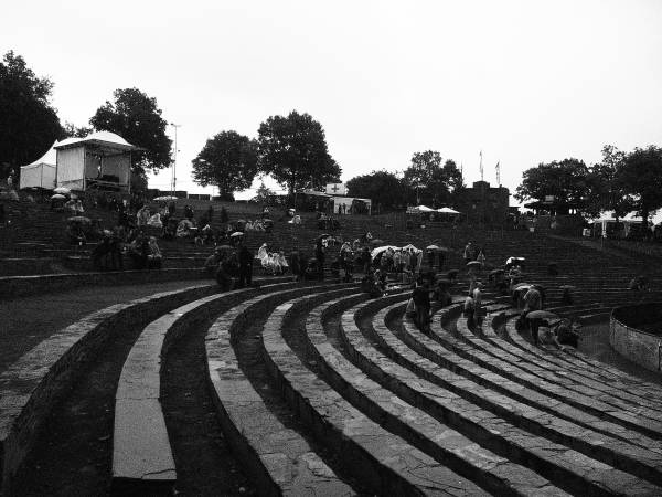 Selbst mit Öffnung der Tore hielt sich der Besucherandrang in Grenzen. Als And also the trees das Festival wenige Minuten nach 15 Uhr eröffneten verloren sich nur wenige Zuschauer auf dem steil ansteigenden Gelände – und sie verpassten bei bestem Wetter einen jener wunderbaren Auftritte der Band, die seit dreißig Jahren existiert und dennoch als Opener fungieren muss. Als Triggerfinger sich zum Soundcheck auf die Bühne begaben, kam der Regen. Es schüttete wie aus Eimern, einige wenige hielten sich mit großen Planen oder Capes bedeckt stehend auf den Sitzplätzen, viele aber suchten Schutz unter den Bierbuden oder den Merchandiseständen. Laut waren sie, Triggerfinger, brachialer Rock dreier cooler Jungs, die gar nicht mehr so jung sind und mit einer mächtigen Bühnenpräsenz daher kamen. Der Regen prasselte hernieder, während Sänger und Gitarrist Ruben Block rockte wie nichts Gutes. Erst gegen Ende ließ der Regen nach, das finale Lied aber war eine eher liebliche Coverversion eines Pophits – und I follow Rivers führte Triggerfinger in Deutschland immerhin auf Platz 12 der Single-Charts.
