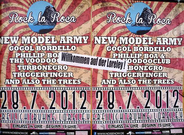 Während die Eintracht die Saisoneröffnung ursprünglich für das Wochende des Valencia-Spiels plante, orderten wir uns Tickets für das Rock la Roca Festival auf der Loreley am 28.07.2012. Prompt wurde die Saisoneröffnung verschoben und somit mussten wir uns entscheiden: Eintracht oder Musik. Da die Tickets schon im Regal lagen, entschieden wir uns für die Musik. Immerhin bildeten mit And also the trees und New Model Army zwei meiner absoluten Lieblingsbands (darf man das heute noch sagen) das Line Up, zu dem sich mit Phillip Boa und Gogol Bordello zwei weitere gern gehörte Acts gesellten. Komplettiert wurde das ganze durch Turbonegro und Triggerfinger. Letztere kannte ich gar nicht und war gespannt. Hochwertiger Indie-Rock also auf der Loreley.