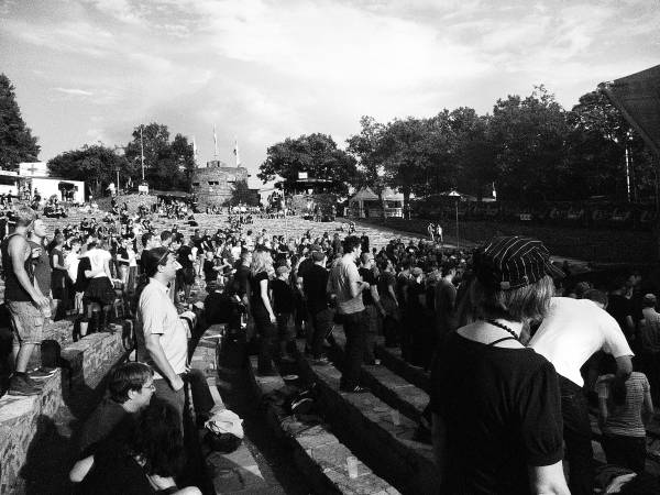Anschließend hatten Turbonegro ihren Auftritt; eine norwegische Band mit häufigem Mitgliederwechsel, Punkhardrock, lustigen Hüten und einer großen Fanbasis, die allesamt Jeansjacken mit dem Aufdruck Turbojugend trugen und großen Spaß hatten. Manch einer trug ein keckes Matrosenhütchen wie der Bassist der Band Happy Tom. Während die Sonne die nächste Schlacht mit dem Regen für sich entscheiden konnte, rockten Turbonegro quicklebendig die Loreley.